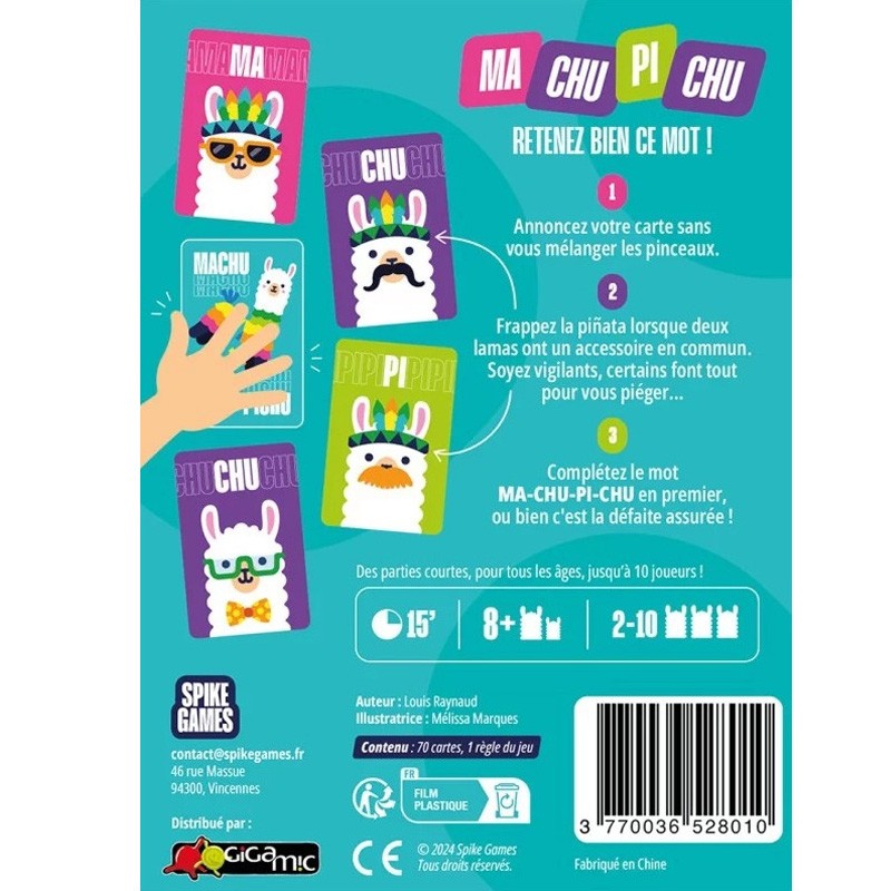 Mais ce n'est pas tout ! Lorsque vous retournez une carte, annoncez le mot écrit dessus. Si une séquence MA-CHU-PI se forme, frappez immédiatement la piñata en criant "CHU" pour terminer le mot. Le dernier récupère toutes les cartes des autres...