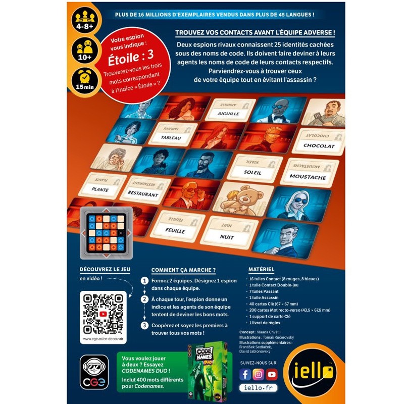 Codenames est un jeu d’association d’idées pour 2 à 8 joueurs (voire plus !) dans lequel, répartis en deux équipes, vous incarnez soit un maître-espion, soit un agent en mission. Pour retrouver sous quel nom de code se cachent vos informateurs, écoutez bien les indices donnés par les deux Maîtres-Espions et prenez garde à ne pas contacter un informateur ennemi, ou pire… le redoutable assassin !