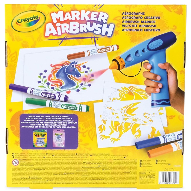 L'aérographe Marker Airbrush de Crayola est facile et amusant pour créer des œuvres uniques avec pochoirs et feutres, sans risque de salissure. Dès 6 ans.