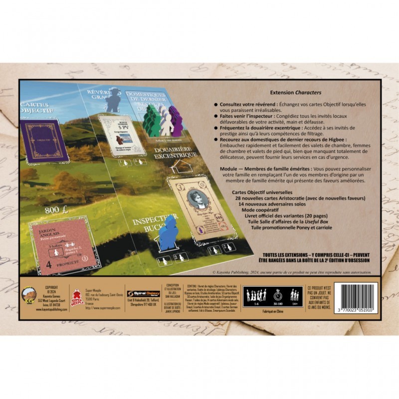 L’extension Personnages d’Obsession introduit dans le Derbyshire de nouvelles personnalités thématiques qui fournissent des actions uniques pour la gestion de votre domaine à la campagne : l’agent Bucket, qui a l’art d’éloigner toutes sortes d’invités peu recommandables, un certain M. Higbee, qui peut trouver de l’aide domestique en cas de besoin (“Des références ? Je suis sûr qu’elles sont ici quelque part…”), le sage révérend Grantly, qui dispense de sages conseils, et une marquise douairière excentrique, qui vous mettra en contact avec un major prussien, un noble suédois et un comte russe en un clin d’œil.
