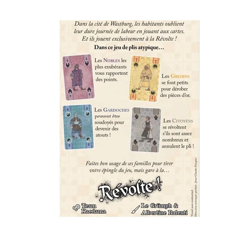 Dans ce jeu de plis inspiré d'un roman et d'un jeu de rôle Wastburg, utilisez les habitants au bon moment mais attention à la Révolte ! Dès 8 ans.