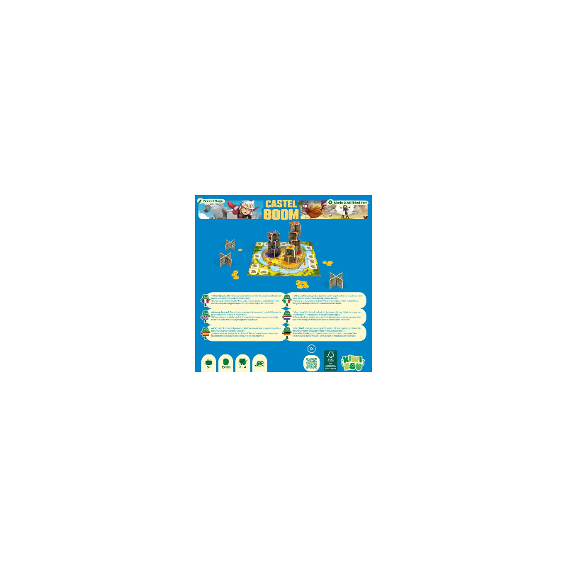 Dans Castel Boom, on se glisse dans la peau de jeunes chevaliers prêts à aider leur roi à rebâtir son château. Le défi est simple en apparence : retrouver les bons morceaux de tour parmi les ruines et les empiler sans les faire tomber. Mais entre les couleurs à mémoriser, les éléments éparpillés et l'équilibre parfois précaire des constructions, ce n’est jamais aussi facile qu’on le croit ! Et le petit plus motivant : chaque pierre posée rapporte une pièce d’or. C’est malin, amusant, et parfait pour jouer en famille.