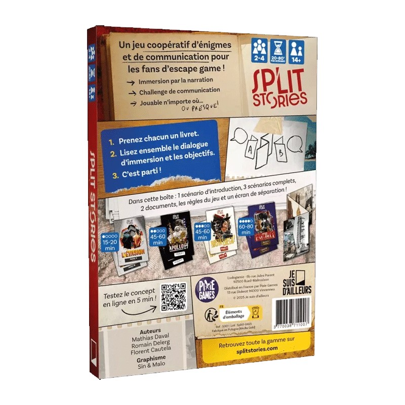Split Stories est un escape game. Chaque équipa reçoit un livret contenant des indices qu'ils devront décrire pour ensemble résoudre les énigmes. Dès 14 ans.
